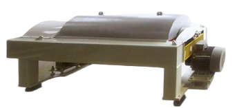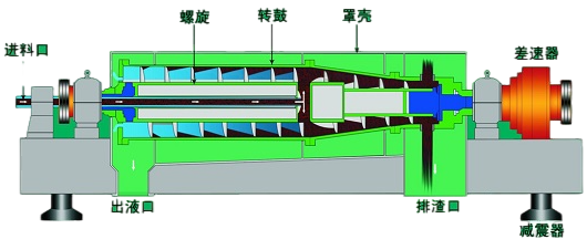 臥式沉降螺旋卸料離心機(jī)由高轉(zhuǎn)速的轉(zhuǎn)鼓、與轉(zhuǎn)鼓轉(zhuǎn)向相同且轉(zhuǎn)速比轉(zhuǎn)鼓略高或略低的螺旋和差速器等部件組成,通過螺旋推料器上的葉片推至轉(zhuǎn)鼓小端排渣口排出,液相則通過轉(zhuǎn)鼓大端的溢流孔溢出。如此不斷循環(huán),以達(dá)到連續(xù)分離的目的。